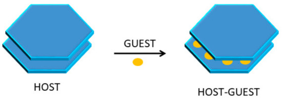ZrP structure indeed is composed by stacking layers made of planes of Zr atoms bonded, on both sides, to monohydrogen phosphate groups. Each phosphate group is bonded to three Zr atoms of the plane, while each zirconium is octahedrally coordinated by six oxygens of six different monohydrogen phosphate groups. The water molecules are located in the zeolitic cavities of the interlayer region [4]. Zirconium phosphate can be easily functionalized through intercalation reactions, and has been widely studied in academic literature with the aim of vehiculate bioactive organic molecules [5,6,7,8,9]. The term ‘intercalation’ refers to a reversible process where a guest molecule or ion is inserted into the interlayer region of a host lamellar matrix [10]. In Figure 1, it is reported a scheme of the intercalation process, where the host is Zirconium Phosphate and the guest is the organic active. Moreover, the electrostatic interactions [11] of the guest molecules and the lamellae of the ZrP also increase its chemical and thermal stability.