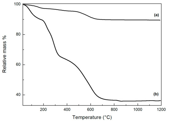 Thermogravimetric analyses (TGA) were carried out with an STD Q600 thermal analyzer TA Instrument (New Castle, United States), in air flow with a heating rate of 10 °C/min.