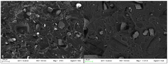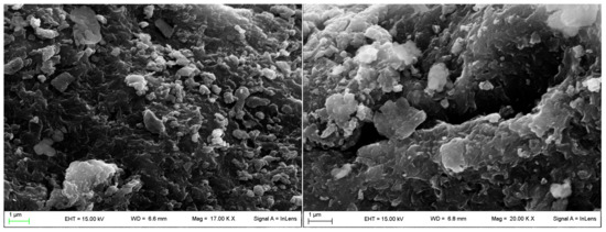 Composites with 5, 10 and 20 wt % of ZrP-GTM were characterized by XRD analysis, to determine the dispersion degree of the filler (Figure 5). No signals of the lamellar filler were detected suggesting a good compatibility between the organo-modified filler and the polymer. The organic modification of the filler with gentamicin seems to produce a good dispersion and confers to the masterbatches antibiotic activity. In order to deeper understand the structure of the composites, they were analyzed by FE-SEM. The three composites presented the same morphological properties; for sake of simplicity in Figure 6, only the micrographs of the PBT/PEOT ZrP-GTM 20 wt % sample are reported. Despite the XRD analysis, it is possible to observe that, in the polymer matrix micrometric, aggregates attributable to the ZrP-GTM filler are still present; therefore, the obtained composites can be classified as micro-composite [34].