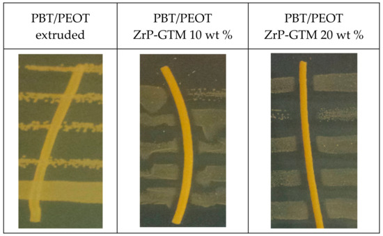Pure PBT/PEOT and composites with 10 and 20 wt % of ZrP-GTM were evaluated using the AATCC145 Test Method, which is a qualitative test for detection of the antimicrobial activity [36]. The method was applied to a precise and weighed quantity of polymer wires, as obtained at the exit of die extruder. In Figure 7, the experimental results of the analysis are reported. Staphylococcus epidermidis colonies correspond to the yellow lines perpendicular to the polymer wires. From the photos, it is evident that, with the neat polymer, the growth of bacteria is diffused; therefore, no antimicrobial effect can be detected for the pure polymer (as expected). In both composites, with 10 and 20 wt % of ZrP-GTM, respectively, the growth of the bacteria is inhibited; in fact, near the wire areas, no colonies are detected confirming the biocidal activity of the composites. Since PEOT/PBT is a bioresorbable polymer [22,23], it is expected that the polymer will slowly dissolve/degrade in the biological medium freeing up the ZrP-GTM included in the composite material. The biocidal activity can be attributed to the ability of ZrP-GTM to slowly release the gentamicin [21], which possesses a well-known antibiotic activity [37].