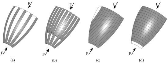 Prepregs are most effective at transferring forces in their fiber direction. In Figure 2a, the fibers are placed in the same direction as force F. Because of the width of the material, the prepregs can no longer be placed without overlapping, and gaps arise. In the next placement strategy Figure 2b, the prepregs are placed in the gaps where an overlap free placement is possible. In this case, the forces cannot be transferred effectively through the shorter prepregs, and there are also gaps on the laminate. In Figure 2c,d, a gap-free placement is theoretically possible, but the prepregs are not placed parallel to force, meaning that the prepregs cannot effectively transmit the forces.