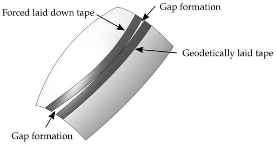 Gaps can also occur if a tape can no longer be laid down exclusively on geodetic paths (a geodetic path is the shortest laydown path between two points on a curved surface). In the case of complex surfaces that cannot be discarded, “forced paths” occur more and more, which are limited on geodetic surfaces (Figure 3). Gaps between these laid tapes occur more often without correction of the laying path. However, a correction of the laying path would lead to a change in the fiber orientation. By changing the fiber orientation, forces can no longer be transmitted optimally, and it has an influence on the mechanical properties of the laminate [8].