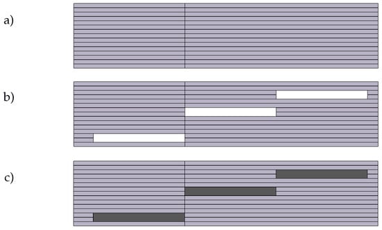 Laminate structure for interlaminar shear strength testing.(a) Laminate without gaps; (b) Laminate with gaps; (c) Laminate with printed continuos fiber reinforced thermoplastic composites.