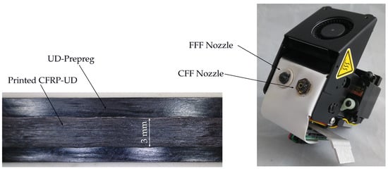Printed unidirectional carbon-fiber-reinforced plastic (CFRP-UD) on UD-Prepreg with Markforged 3D printer head; FFF (Fused Filament Fabrication), CFF (Continuous Filament Fabrication).