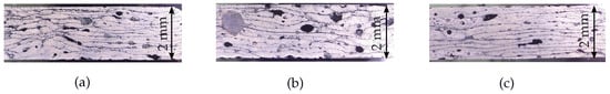 The test specimens were pressed in an aluminium mould at 260 °C under a pressure of 10 bar for 15 min. In the automated process, consolidation must be applied through a compaction system via the AFP head. In the microscopic cross-sectional images of the unidirectional (UD)-laminates (see Figure 7), the distribution of the carbon fibers in the laminates is different. That is, the laminates without gaps and the laminates with printed CFRP-UD were almost identical. However, the laminates with gaps had significantly less fiber volume and higher porosity compared to the laminates without gaps and laminates with printed CFRP-UD.