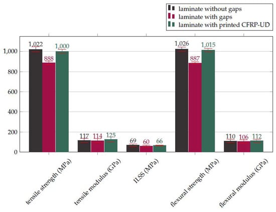 The mechanical properties of the three specimens were experimentally characterized. In all cases, as expected, laminates with gaps had poorer mechanical properties than other laminates (Figure 8).