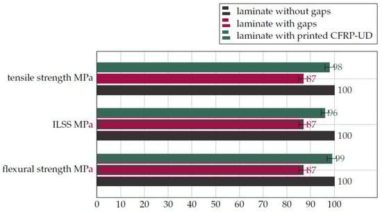 The tensile strength, interlaminar shear strength, and flexural strength of the laminate with gaps were reduced by about 13% compared to the laminate without gaps. Accordingly, the tensile strength of the laminate with printed CFRP-UD was approx. 2%, the interlaminar shear strength was approx. 4%, and the flexural strength was approx. 1% less than that of the laminate without gaps (Figure 9). The main task of the carbon fiber is force transmission. This gap effect results in a reduction of the carbon fiber used. The gaps are filled with matrix or remain as voids in the laminate. Additionally, the layer of carbon fiber is shifted where the gaps are, and the forces can no longer be transmitted optimally. These factors reduce the mechanical properties of the laminate. The consolidation process in this research developed into a hot-pressing machine under vacuum. In automated fiber placement with thermoplastics, consolidation is often carried out in situ. Therefore, the potential for poor laminate quality in consolidation is higher. This method fills the gaps with carbon fiber, and the laminate quality remains very close to a laminate without gaps. In this study, only unidirectional laminates were investigated. If the fiber directions are not unidirectional (e.g., with double curved surfaces), the prints of the gaps can be even more useful.