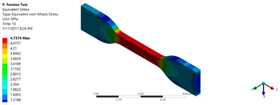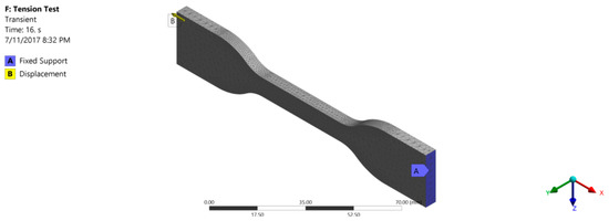 The geometric model used for simulating the tension test is shown in Figure 2. To perform the simulation, one end of the specimen was provided with a fixed support whereas the other end was provided with a displacement in the axial direction.