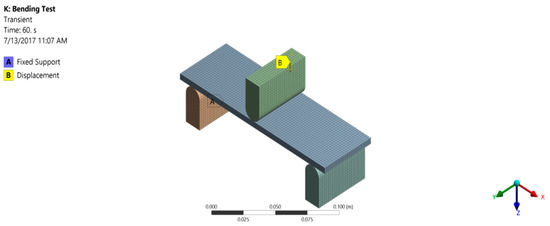 After performing the simulation of tension test successfully and defining material properties in the software, a static three-point flexure test was performed to validate the technique. The geometric model used for the flexure test is shown in Figure 3. The two lower supports were declared as fixed and a constant displacement, calculated using the standard, was given to the crosshead at the middle to produce bending effects in the specimen. This defines the problem simply to be a supported beam with a point load at the center.