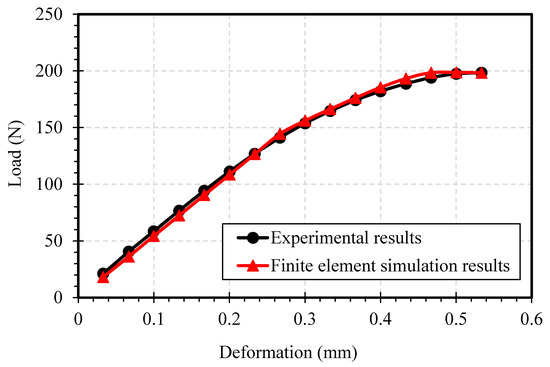 Plot of load vs deformation of tension test for experimental and finite element simulation.
