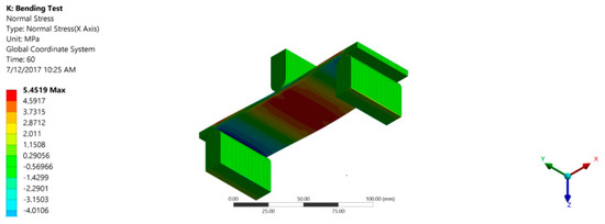 Image of simulation showing normal (flexural) stresses of sample in static bending test.