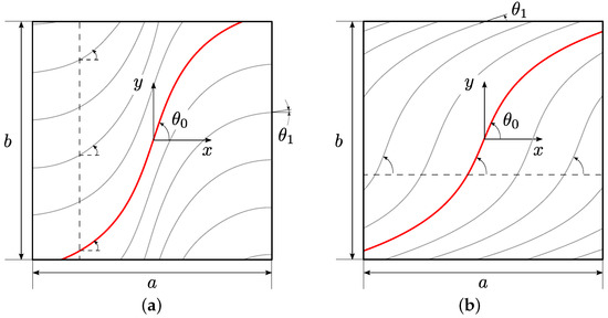 According to the notation adopted here, a ply denoted with is characterized by a fiber variation along the x-axis, where is the orientation, measured with respect to the x-axis, at the plate center, and the one at the plate edge (see Figure 1a). Similarly, steering of the fibers along the direction y is denoted with (see Figure 1b). Starting from the fiber passing through the plate center, the other ones are obtained by translation of the reference fiber along the x- or y-direction, referring to a strategy sometimes denoted as a shifted method [26,41].