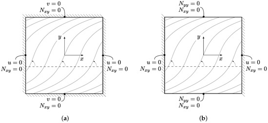 The first set of conditions is illustrated in Figure 2a, and is relative to a VSP with fibers varying along the direction x. The in-plane conditions are such that normal displacements at the boundaries are zero. Recalling Equations (17) and (19), the axial shortening along the x-direction is then:
