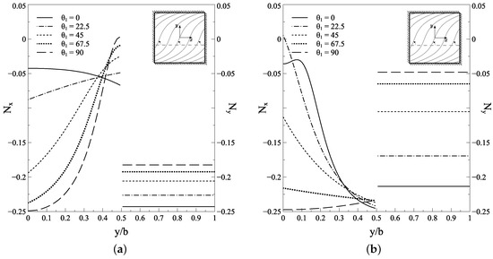 Pre-buckling membrane resultants for laminates subjected to Case-Ty2 conditions: (a) ; (b) .