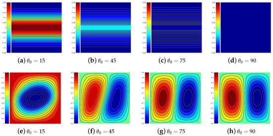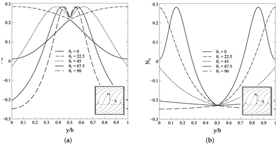 From the results of Equation (36), it is seen that no membrane forces develop along the transverse direction as a response to a uniform heating or cooling. The distribution of internal forces is then purely uniaxial. The behaviour of plates characterized by equal to 15 is summarized in Figure 7a. One can note that steering the angle from 0 to 90 has the effect of increasing the laminate thermal coefficient, thus increasing the amount of compression introduced at the outer edges. For the case at hand, the smallest values of (0, 22.5) are characterized by a state of internal traction: thermal buckling is thus possible only if the plate is cooled. The same conclusion holds for equal to 45 and 67.5, as the compression region is relatively small. When is equal to 90, an internal state of compression is promoted, thus making the onset of instability phenomena possible due to heating.