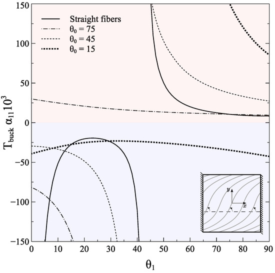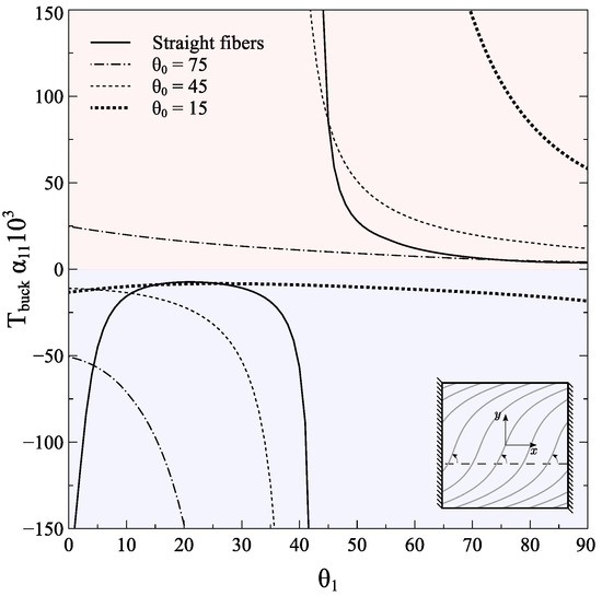 The curves of Figure 8 highlight the effect of steering the fibers. One can note that the region of instability due to heating tends to shift on the upper-right part of the plot as is reduced. Indeed, resistance against thermal heating is provided by longitudinally directed fibers. On the contrary, the effect of progressively rotating the center plate fibers along the longitudinal direction is that of shifting the cooling stability region to the bottom left of the plot: the matrix-dominated behaviour, at least in the central part of the plate, has the effect of improving the resistance to cooling. It is interesting to highlight that, for some range of values, buckling is possible both for heating and cooling, for temperatures that may reasonably be retained in the field of material linear response. For instance, when is equal to 75 and is 0, positive and negative critical non-dimensional temperatures are possible with absolute values of 24.74 and 50.68, respectively. The co-existence of positive and negative buckling multipliers is not possible for straight-fiber configurations, where the uniform pre-buckling condition is strictly compressive or tensile. The outlined response is thus peculiar of variable-stiffness plates, where the variability of the internal pre-buckling forces allows for the presence of non-uniform membrane force resultants with compressive and tensile regions. With similar motivations, one can observe that thermal buckling due to heating is always possible for the configurations with equal to 75, irrespective of the values of the fiber orientation at the edge .