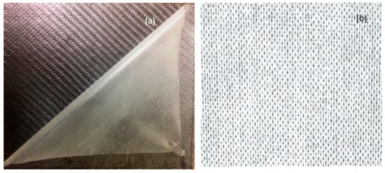 (a) Woven carbon fiber/epoxy prepreg before curing. (b) Polyester synthetic surface veil.