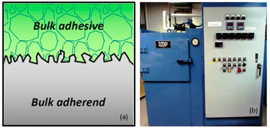 (a) Mechanical interlocking induced due to crevices produced by abrasion [42]. (b) Autoclave vacuum press machine used for curing the laminates.