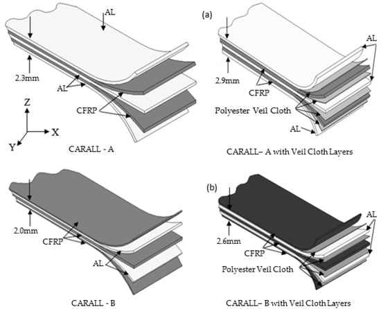 Carbon fiber/epoxy—aluminum laminates’ nomenclature and stacking sequence. (a) CARALL-A specimen schematic (b) CARALL-B specimen schematic.