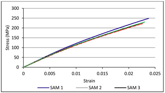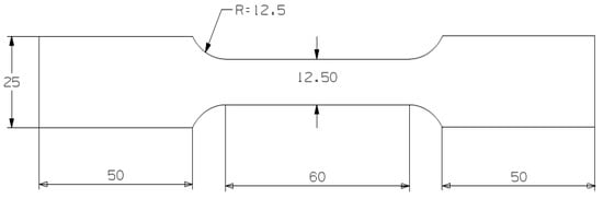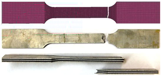 Tensile tests were conducted on CARALL fiber metal laminate samples according to the ASTM D 3039 standard to obtain Young’s modulus, the tensile strength, and the strain to failure, as well as the failure modes of each system. Tensile tests were conducted at room temperature (25 °C) on the standard specimens and the results were compared together to study the mechanical behavior of both fiber metal laminate configurations. The nominal dimensions of samples are shown in Figure 5.