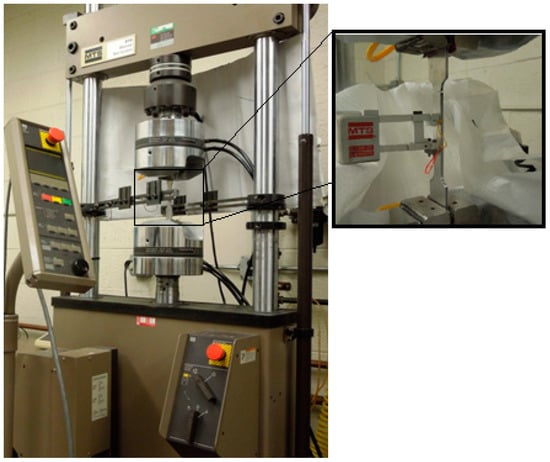 Tensile tests were carried out at a constant displacement rate of 0.05 mm/s using a Material Testing System (MTS) Instron machine equipped with hydraulic wedge grips with a 200 KN force capacity. A clip-on extensometer with a gauge length of 20 mm was used to measure the modulus of elasticity of each sample. The load transducer, which was located on the top, recorded the load taken by the beam. The load taken by fiber metal laminated beams, machine displacement, and time duration of the test were written down at 0.1 s intervals with the help of the computerized controlled compression testing machine. The entire duration of tensile tests was monitored with the help of pictures and videos, which were later analyzed for critical failure mode and correlated with the time data obtained from the computerized controlled data acquisition system. The complete test setup, including the MTS Instron testing machine and the FML specimen, during the tensile test is shown in Figure 6.