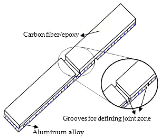 Double notch shear tests on carbon fiber/epoxy and aluminum symmetric hybrid samples were done as per the ASTM D3846 [43] test method. Hybrid fiber metal laminate samples of 152.4 mm × 12.7 mm containing six plies of woven carbon fiber/epoxy prepreg on each side of the aluminum sheet having a 1 mm thickness were cured for double notch shear tests. The groove was cut into the carbon fiber and aluminum layers, and with the help of a Dremel tool, to define a joint zone of 12.5 mm. To avoid direct pressure on the laminate in the gripping area, grit paper was used on the laminate. A schematic of the hybrid FML test sample is shown in Figure 7.