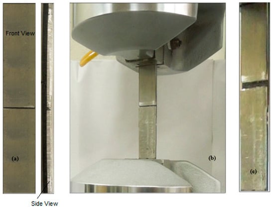 Double notch shear tests were performed by using an MTS machine at a strain rate of 0.5 mm/s. The load carried by the carbon fiber/aluminum bond length was converted to stress data by using a force-stress relationship formula to get the shear strength of the bond between the carbon fiber and aluminum layers. A double notch test coupon secured in the MTS testing machine and a damaged test coupon is shown in Figure 8.