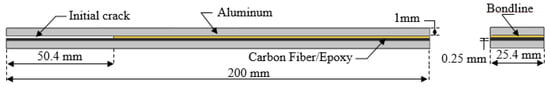 Hybrid FML specimens with 200 mm × 25.4 mm geometrical dimensions containing a 50.4 mm initial crack provided by placing a Teflon sheet in between the woven carbon fiber/epoxy prepreg and aluminum sheet each having 1 mm thickness were cured for T-peel tests. Prior to bonding, the surface roughness of the aluminum adherend was increased with grit paper of size 60, and then degreased with acetone. The hinges were glued to specimens in the region having the initial crack with the help of the epoxy resin by keeping it at room temperature for curing by itself for 24 h. The purpose of using the hinges was to not fix the angle between the bond line and the direction of applied force during the test. The specimen schematic with dimensions is shown in Figure 9.