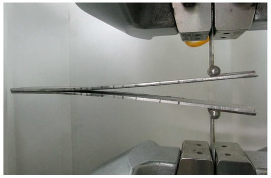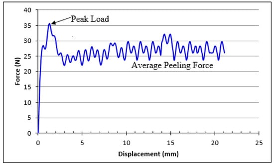 Tensile tests were conducted with a displacement rate of 0.5 mm/s on specimens under standard laboratory conditions (23 °C/50% relative humidity) according to ASTM specifications. The specimens were held by a pair of well-aligned servo-hydraulic operated wedge action grips with a lateral pressure of 0.7 MPa. Instron MTS machine software was used to control the test machine and to collect the test data. Five specimens per conditions were tested. Figure 10 illustrates the specimen during the T-peel test.