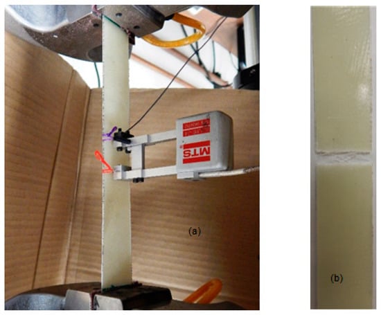 Tensile tests were carried to determine the properties of the polyester synthetic veil/epoxy layers so that parameters could be used as input to the finite element analysis. A panel consisting of eight layers of polyester surfacing veil/epoxy, having 200 × 200 dimensions, was prepared by employing the hand layup method and cured with an autoclave vacuum press using the same curing cycle as the carbon fiber/epoxy. The cured panel was cut into test coupons with dimensions of 200 mm × 25.4 × 1.3 ± 0.15 mm, with the help of a band saw. The cross section samples were maintained as rectangular to avoid failure near the grip. To avoid direct pressure on the specimen in the grip area, grit paper was used on the laminate in the gripping. An extensometer was used during the test to obtain strain data from the coupon. The specimen during the tensile and damaged coupon after the test is shown in Figure 11.