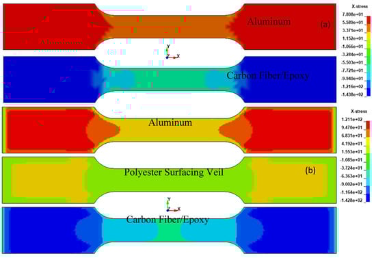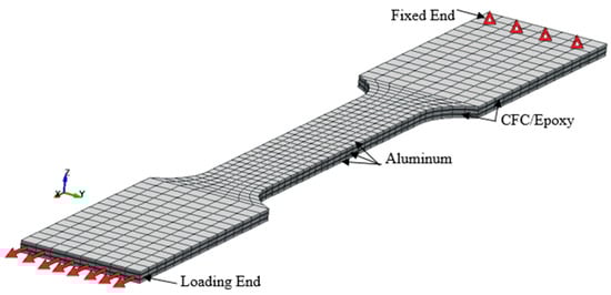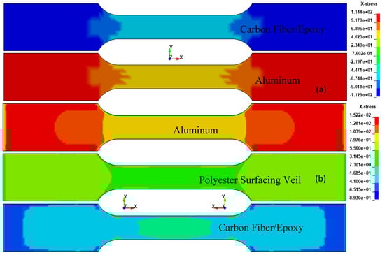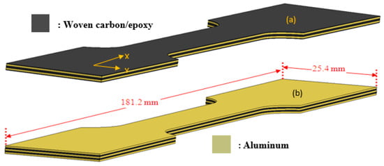 The thermal load is ΔT, the temperature difference between ambient temperature and cure temperature. The thermal load was applied through. Thermal Load Curve keyword on the FE model. The aluminum layers were modeled using a piecewise linear plasticity model. An enhanced composite damage material model and plastic kinematic model were employed for modeling the carbon fiber/epoxy and synthetic surfacing veil layers [47]. A thermal expansion coefficient was added to both materials through an add thermal expansion material card. The contact between adjacent layers was applied using the tied surface to surface contact algorithm. Material properties are assumed to be independent of temperature during analysis and in the final (after cool down) phase. The material properties of carbon fiber/epoxy and aluminum layers used in the residual thermal stress modeling are given in Table 2 and Table 3. Finite element models developed for thermal residual stress prediction for tensile specimens are shown in Figure 12.