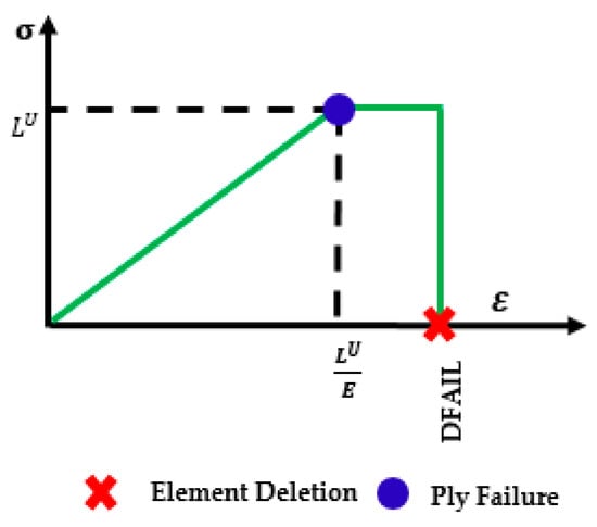The FBRT parameter defines the percentage of the pristine fiber strength that is left following failure, therefore, its value may only be in the range [0, 1]. The YCFAC parameter uses the pristine matrix strength, YC, to determine the damaged compressive fiber strength, which means that the upper limit of YCFAC is XC/YC. The input value for the two parameters, FBRT and YCFAC, cannot be measured experimentally and must be determined by trial and error. The failure equations described in Equations (2)–(8) provide the maximum stress limit of a ply, and the damage mechanisms described in Equations (9)–(11) reduce the stress limit by a specified value given specific loading conditions. None of these mechanisms, however, causes the ply stress to go to zero, as would be expected of a failed ply. Instead, five critical strain values reduce the ply stresses to zero.