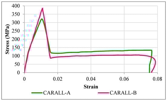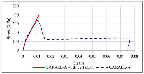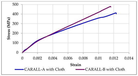 It can be observed from Figure 24 that the tensile strength of CARALL-B is more than CARALL-A FML. Carbon fiber/epoxy and aluminum layers fail at different strain values in both FMLs as the interface bonds are not strong enough to transfer the stresses to aluminum layers after the failure of carbon fiber/epoxy layers. Carbon fiber/epoxy and aluminum layers failed at a strain value of 0.011 and 0.078, respectively, in both configurations. The difference in the strength values of aluminum layers after the failure of carbon fiber/epoxy layers at a tensile strain level of 0.011 in both FMLs is due to the volume fraction of aluminum layers. The strength of aluminum layers is reduced to about 125 MPa in CARALL-A FMLs whereas in CARALL-B, it is reduced to 100 MPa due to a lesser volume fraction of aluminum in CARALL-B. The interface bond between the carbon fiber/epoxy lamina and the aluminum plays an important role in the transfer of stresses in FML composites as the fiber matrix interface bond plays in the carbon fiber reinforced laminate composites. The addition of polyester surfacing veil cloth makes the interface bond much stronger. This statement is attributed from the fact that in CARALL specimens made with veil cloth layers, the entire laminate failed at the same strain level, i.e., ≈0.012, due to a more efficient transfer of stresses between the different layers of laminate. Whereas in CARALL specimens made without veil cloth layers, the carbon fiber layers and aluminum layers failed at different strain values as the interfacial bond was not strong enough to transfer the tensile stresses between layers. The comparison of CARALL A specimens made with and without cloth layers shown in Figure 26 clearly supports the above statements. In addition to making the interface bond stronger, the addition of polyester veil cloth also increases the ultimate tensile strength of both CARALL FML specimens, which can be inferred by comparing Figure 24 and Figure 25.
