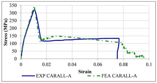 FEA and experimental stress-strain plots for CARALL-A specimens.