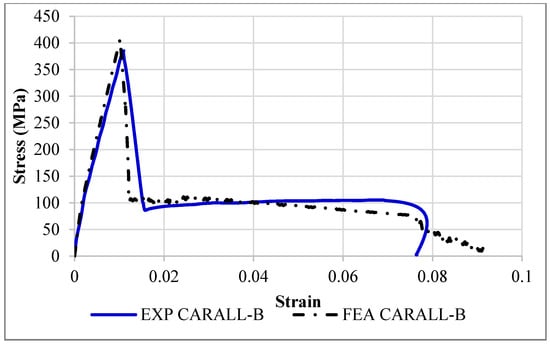 FEA and experimental stress-strain plots for CARALL-B specimens.