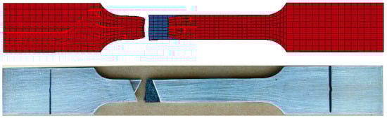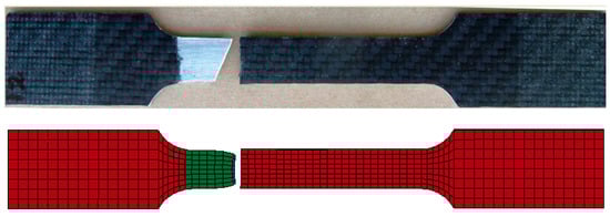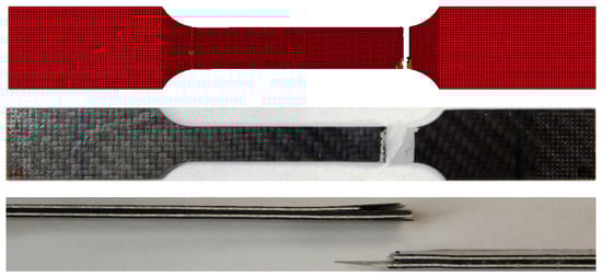 It can be clearly inferred from the fracture surfaces of experimental failed specimens that aluminum layers in FMLs of all combinations were fractured at an angle approximately equal to 65 degrees to the loading direction due to the direction of the dislocation-related slip plane and slip direction of the metal crystal [58]. The carbon fiber layers fractured almost at an angle of 90 degrees to the loading direction, showing good bonding strength between the carbon fiber and epoxy matrix. Finite element models also captured the fractured surfaces of aluminum and fibrous layers of all FMLs combinations, depicting a necking induced fracture surface for aluminum layers and 90 degrees fractured surface for carbon fiber layers. A comparison between tensile properties of both FML types and monolithic 5052-H32 aluminum alloy are tabulated in Table 11. It can be observed from the tabulated results that there is a significant increase in the tensile strength in comparison to the aluminum 5052-H32 strength for both types of FMLs whereas the modulus of FMLs and monolithic aluminum is comparatively similar. The correlation between experimental and FEA damage morphology of CARALL-A and CARALL-B specimens made with veil cloth layers are shown in Figure 33 and Figure 34.