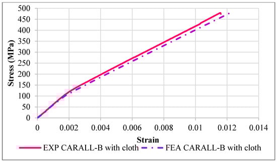 FEA and experimental stress-strain plots for CARALL-B specimens having veil cloth.