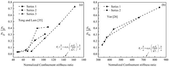 Effect of FRP confinement stiffness on hoop strain ((a) specimens of Teng and Lam [35] and (b) specimens of Yan [26]): εfe = average FRP hoop strain from gauges on minor and major section sides; εfu = FRP tensile strain obtained from flat test coupons.