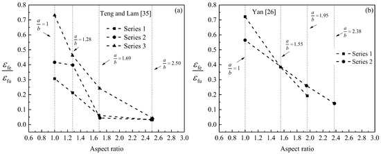 Effect of aspect ratio on FRP hoop strain ((a) specimens of Teng and Lam [35] and (b) specimens of Yan [26]): εfe = average FRP hoop strain from gauges on minor and major section sides; εfu = FRP tensile strain obtained from flat test coupons.