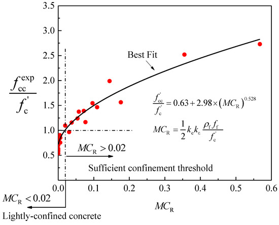 Therefore, this discussion focuses on determining the following indicator that can ensure a sufficient confinement for the existing reinforced concrete columns. The relationship between MCR and the ratio of the test peak strength to the strength of unconfined concrete was presented in Figure 4. The regressed line was only based on the results provided in Table 1 due to the unavailability of relative tests in the technical literature. On the basis of the regressed line, when fcc′/fc′ = 1.0, the MCR value is equal to 0.02. When the MCR is greater than the 0.02 value, then fcc′/fc′ > 1.0, where fc′ = unconfined concrete strength and fcc′ = FRP-confined concrete strength at peak. This means the fcc′ is greater than fc′, and, as a result, the confined specimen experienced enhancement in axial strength and ultimately exhibited an ascending stress-strain response. In contrast, when the MCR is less than 0.02, a second post-peak softening component occurs in the stress-strain response, as reported in several tests conducted on large-scale columns lightly confined with CFRP in some of the recent studies, e.g., [16,17,18,20,21,22].
