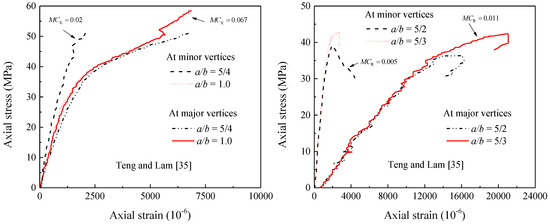 The experimental tests of Teng and Lam [35] included five groups of specimens (S1, S2, and S3) divided according to their sectional aspect ratios a/b (1.0, 1.28, 1.7, and 2.5) and prepared from the same batch of concrete as provided in Table 1. Each group included one specimen with a circular section and three elliptical specimens. The cross-sectional area and height of the elliptical specimens were almost equivalent to those of the circular sections. All of the specimens were 608 mm in height. The unconfined concrete strength was obtained from compressive tests on three cubes of 150 mm. Only the third and fourth groups as control specimens were considered without FRP confinement, while the other groups were with different levels of CFRP confinement (i.e., two layers). The variables considered in the tests were (1) the sectional aspect ratio, (2) the batch of concrete, and (3) and the number of CFRP layers. The specimens’ designation, S5/4L2, for example, had a cross-sectional aspect ratio of 1.28 and was confined with two layers of CFRP wraps.