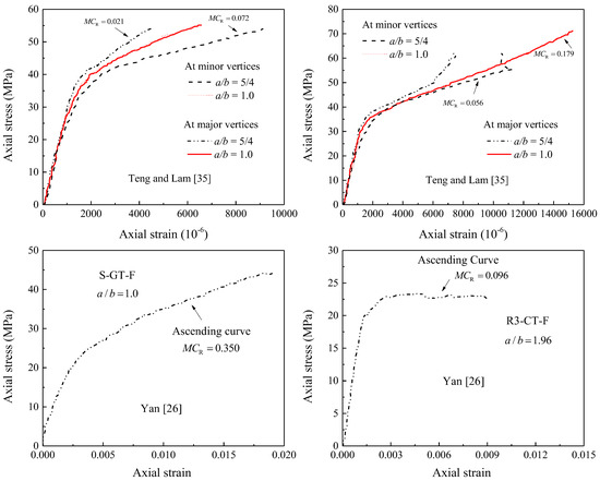 Table 3 lists the effective confinement pressure ratios calculated by the proposed MCR and the existing models (i.e., models 1, 2, and 3) for a total of 18 FRP-confined specimens selected from Yan [26] and Teng and Lam [35] studies. As shown, the models are not able to represent the actual results of their peak strengths. Therefore, based on the analysis of the same test database, the following expressions for estimating the strength and corresponding strain for columns with elliptical sections are proposed, where the R2 values for the two expressions are respectively 96 and 93%.