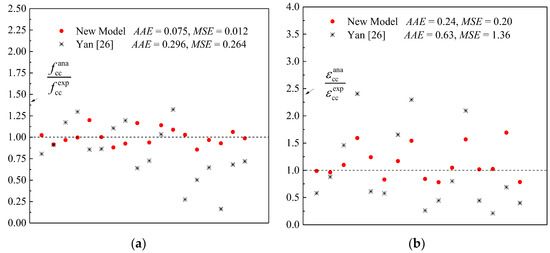 In this subsection, the performance of existing models that are proposed for estimating the confined strength and strain enhancements of elliptical–sectioned columns due to the confinement provided by the FRP is assessed against the experimental results summarized in Table 1. To check the overall model accuracy, the two factors, namely, (1) the average absolute error (AAE) (Equation (11)) and (2) the mean square error (MSE) (Equation (12)) are used. It should be noted that there are no other comparisons in the figure with other results and models due to the very limited research conducted on the axial compressive behavior of FRP confined concrete in elliptical cross sections. As reported in the figures, Equations (7) and (8) are able to predict with good accuracy (AAE = 7.5% and MSE = 12%) the fcc′ but show less accuracy (AAE = 24.0% and MSE = 20.0%) in predicting the corresponding strain εcc. Significant variability in the confined strain values was also reported in numerous studies (e.g., Hany et al. [52,53]). It can be generally observed from the comparisons provided in Figure 6a,b that the analytical values given by the proposed Equations (7) and (8) agree well with the test results compared with the model proposed by Yan [26].