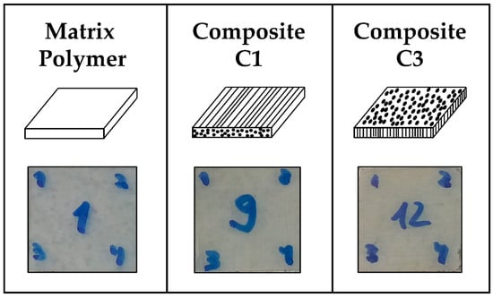 Glass fiber-reinforced epoxy composite laminates were prepared using vacuum assisted resin transfer moulding (VARTM). The same epoxy resin was used as for preparation of polymer samples. The composite laminate was cut into rectangular bars and subsequently into plates with different fiber orientations (C1 and C3 as shown in Figure 1). The dimensions of plates were 25 mm × 25 mm × 2 mm. The thickness was adjusted to 2 mm within 5% tolerance via grinding with a super fine sandpaper (FEPA P800, grain size 21.8 µm). The specified dimensions were achieved within 5% tolerance.