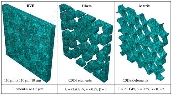 Finite element model of the representative volume element (RVE): fiber and matrix properties are also shown.