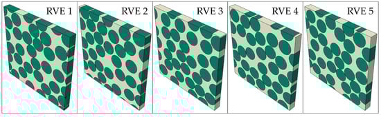 In order to account for the deviations in the swelling coefficients due to the random fiber distribution in the RVE, five RVEs having the same fiber volume fraction were modelled, as shown in Figure 4. This allows the deviation in swelling coefficient due to the fiber random arrangement to be quantified.