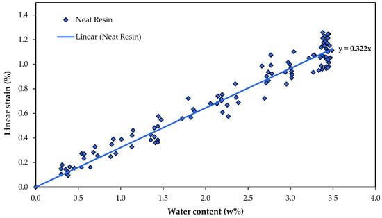 Hygroscopic strains were measured after various exposure times to water for both matrix polymer and composite samples (C1 and C3). The experimentally obtained evolution of linear strains with increasing water contents for the polymer and composites, is shown in Figure 5 and Figure 6, respectively.