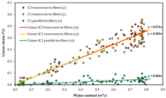 where stands for , and for respective swelling directions. Composite C1 was used to obtain swelling coefficients in the direction parallel to fibers () and transverse to fibers (), while composite C3 also provided transverse-to-fibers swelling () which was similar to and consistent with .