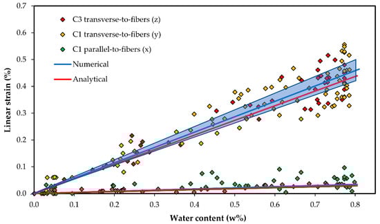 In the fiber direction, both analytically and numerically obtained coefficients of hygroscopic swelling are close, 0.036 and 0.044, respectively. Both values are slightly higher than the experimental value obtained via linear regression 0.060 ± 0.018. Such discrepancy is reasonable considering the low determination coefficient in the linear regression of experimental data (0.3110) and low strains involved resulting in larger experimental data scatter.
