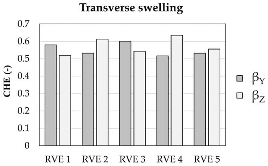 Swelling coefficients in transverse directions y and x for the five RVEs used in the simulations.